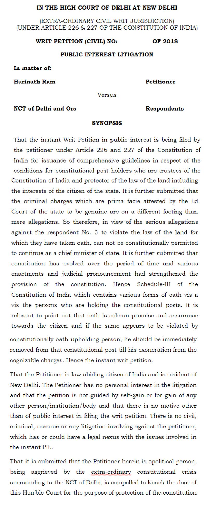 The counsel of the petitioner has asked the court to issue appropriate writ directing the Lieutenant Governor Anil Baijal to remove Kejriwal as chief minister.