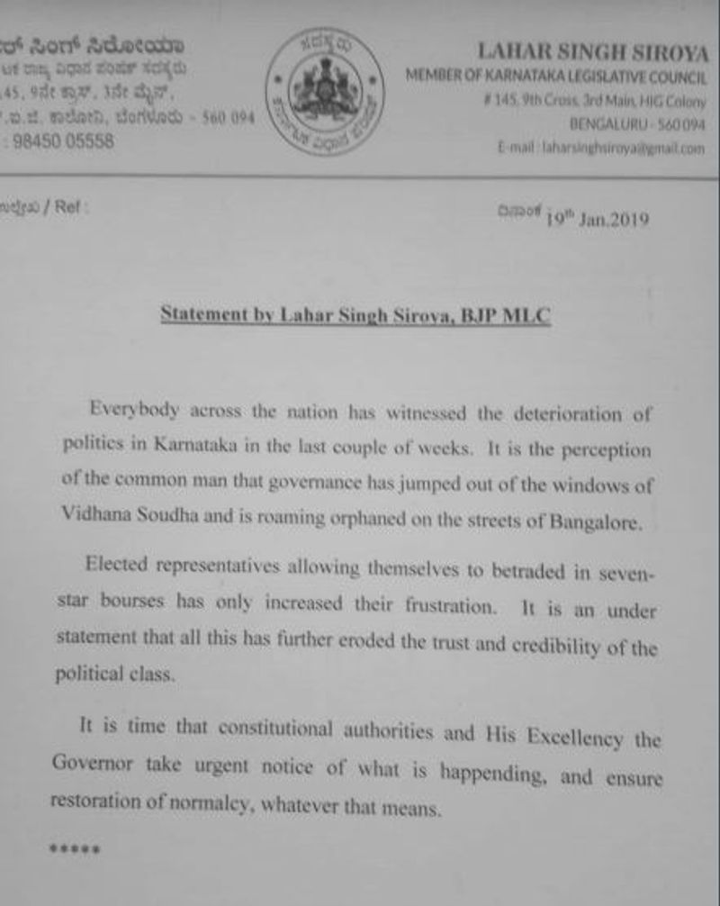 Raising questions on 'resort politics', BJP MLC Lehar Singh has issued a statement requesting the Governor to take action to ensure the MLAs of Karnataka get back to 'doing their duty, which is governance'.