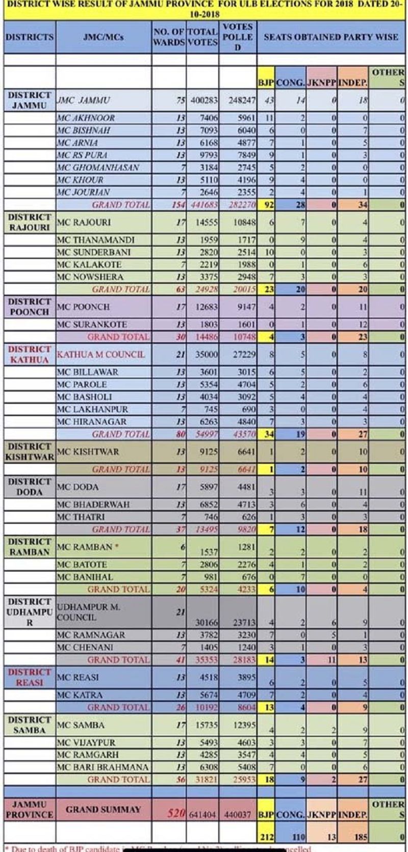 The BJP did well in Shopian where its candidates won in 12 wards unopposed. Five wards in the district did not have any nominations.