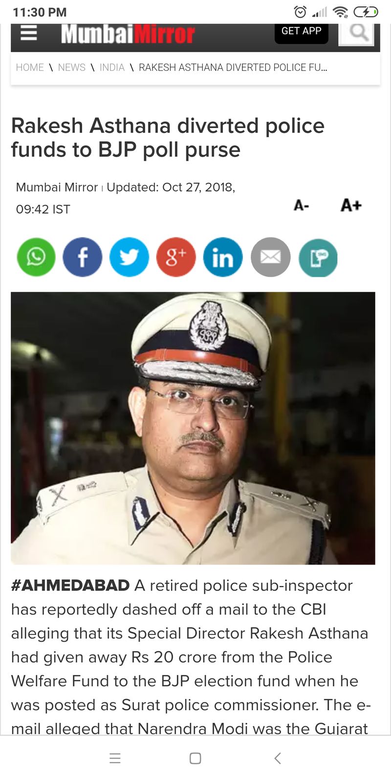 Some media organisations reported that a retired police sub-inspector wrote an email to the CBI saying that Asthana diverted the fund from the Police Welfare Fund when he was posted as Surat police commissioner — a time when Narendra Modi was the Gujarat Chief Minister.