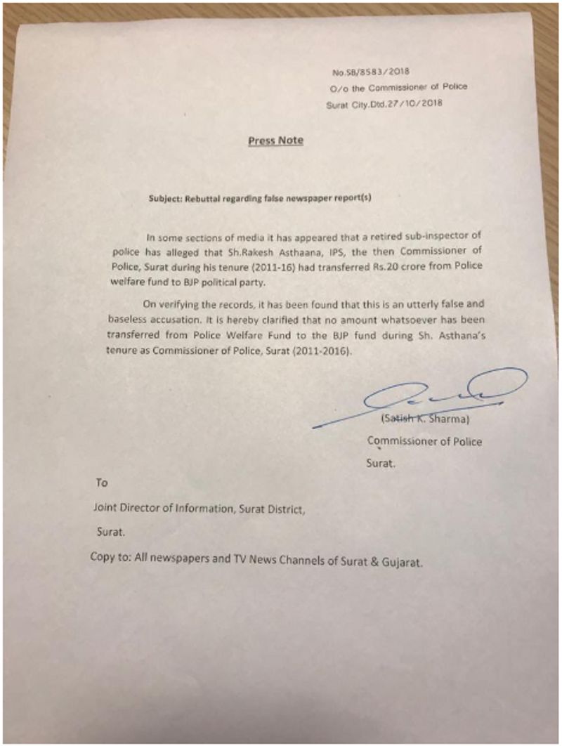 However, Surat police, rubbishing the entire event, said in a press release that it was an “ utterly false and baseless accusation” and confirmed that no amount has been transferred to the BJP fund during the tenure of Asthana.