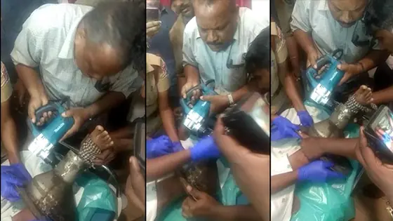 Chennai: A woman travelling in a train in Chennai slipped in the train toilet and her leg got stuck in the steel toilet. The 40-year-old Bharathamma failed to pull her leg out and called for help. When even the co-passengers could not pull her leg out, the Railway Protection Force (RPF) personnel used a steel cutter to free her leg. She was working in Chennai and was travelling to Vemanapalli, Andhra Pradesh in the Charminar Express on Wednesday. Here is the video of how Bharathamma's leg was freed from the toilet seat.