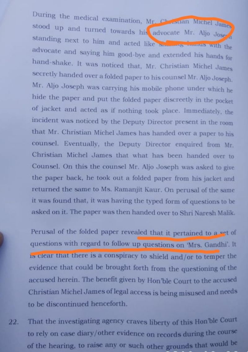 ED report submitted to the court said: “During the medical examination, Mr Christian Michel James stood up and turned towards his advocate Mr Aljo Joseph standing next to him and acted like shaking hands with the advocate and saying him good bye and extended his hand for hand shake. It was noticed that Mr Christian Michel James secretly handed over a folded paper to his counsel Mr Aljo Joseph. Me Aljo Joseph was carrying his mobile phone under which he hid the paper and put the folded paper discreetly in the pocket of jacket and acted as if nothing took place.