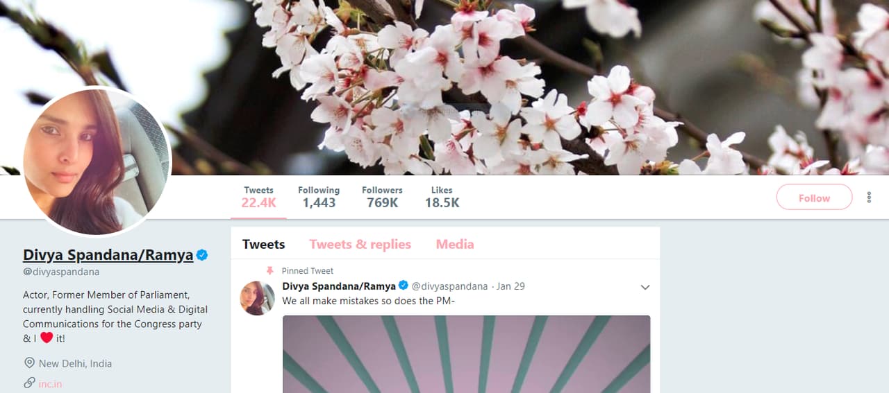 While no personal information can be seen now on the handle's homepage, it used to earlier say: “Actor, Former Member of Parliament & currently handle (sic) Social Media & Digital Communications for Congress & I love it (sic)!”.