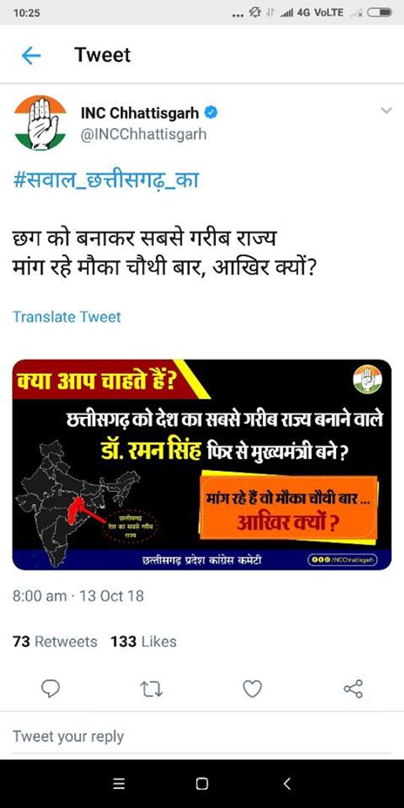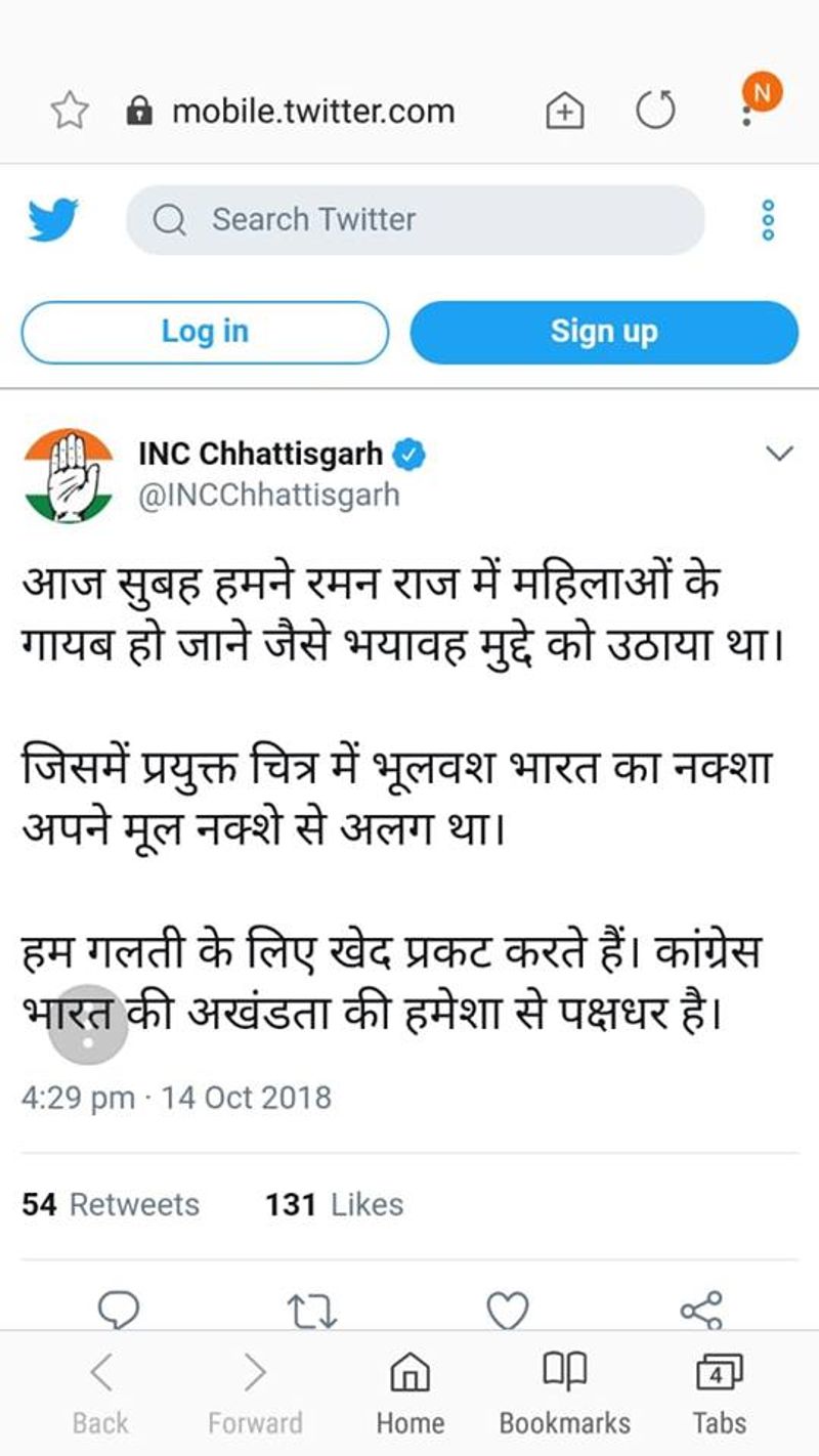New Delhi: The Chhattisgarh unit of the Indian National Congress tweeted a map of India on October 13 where the entire Kashmir was not visible. This happened as the handle was attempting to blame chief minister Raman Singh for making the state poorer.