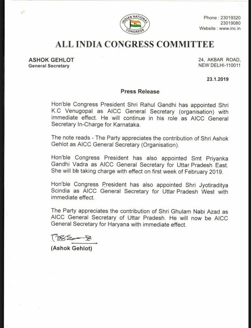 The party statement talks about other appointments as well – such as that of Jyotiraditya Scindia, who will be taking care of Western Uttar Pradesh, close Rahul aide KC Venugopal as the general secretary (organisation), elevation of Ghulam Nabi Azad to the post of general secretary (Haryana).