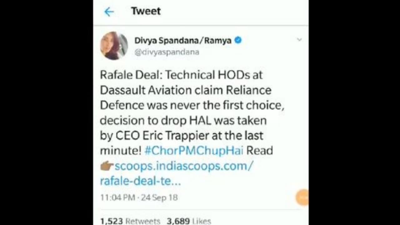 New Delhi: Congress IT cell head Divya Spandana posted an article on Twitter on Monday about the Rafale Deal. The article was about how the technical heads at Dassault Aviation claimed that Reliance Defence was never their first choice, and the decision to drop HAL was taken by the CEO at the last minute. Spandana shared the article from a website called IndiaScoops.com.