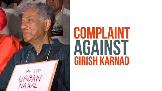 A complaint has been filed against veteran actor/writer Girish Karnad for wearing a placard that read 'Me Too Urban Naxal' at a commemorative meeting marking the first death anniversary of slain journalist Gauri Lankesh in Bengaluru. The complaint was filed by lawyer Amrutesh. He said Girish Karnad has accepted that he is a naxal and police should take action against him since naxalism is banned in the country.