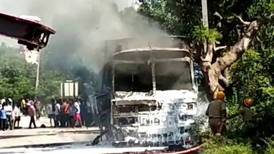 Bengaluru: A motorcycle collided with a truck carrying gas cylinders in Kattugollahalli, in the outskirts of Bengaluru, claiming the rider's life. Following the accident, the truck caught fire. The deceased has been identified as Somashekar, a resident of Devanahalli. With an immediate response from the fire extinguishers, the fire fighters managed to extinguish the fire. A case has been registered in Avalahalli police station, and further reports are awaited.