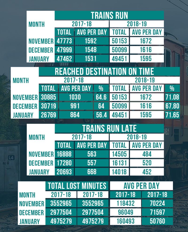 Figures of December and November 2018 are also encouraging. In December, the Railways brought down minutes lost due to train delays to 71,597 compared to 96,049 minutes in 2017. Similarly, in November 2018, lost minutes stood at 70,224 compared to a whopping 1,18,432 minutes in November 2017.