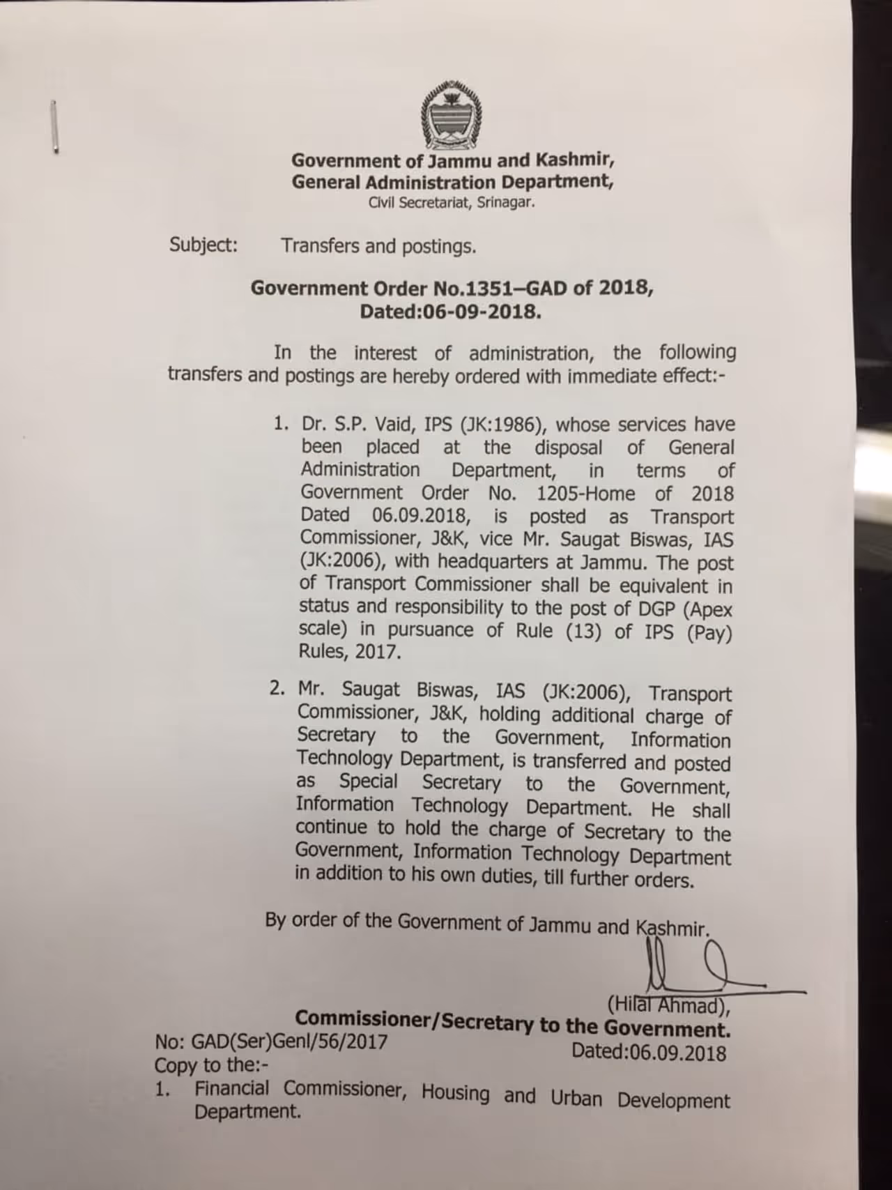 An order issued by the Principal Secretary (Home) said that SP Vaid has been transferred to the post of Transport Commissioner