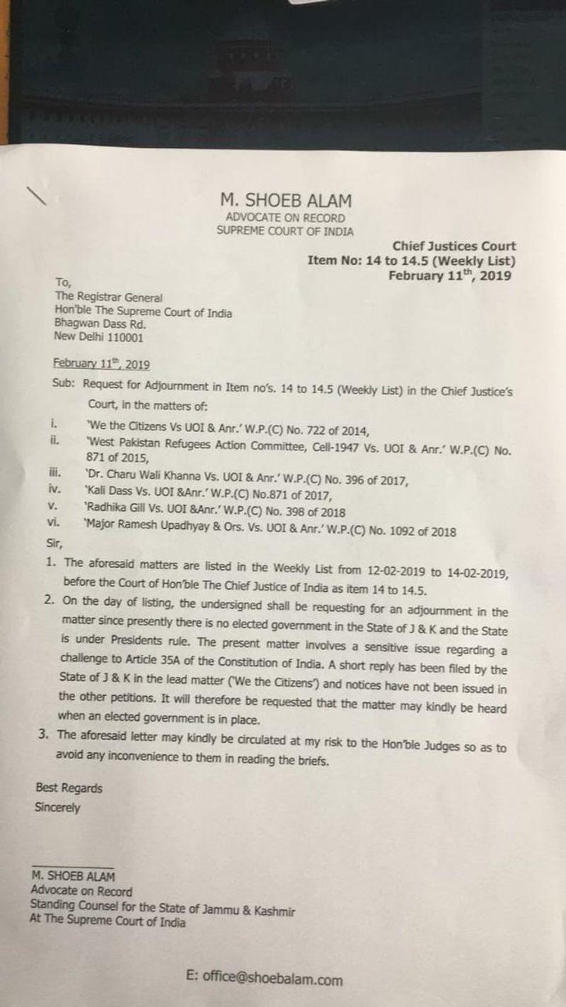 In a letter to the apex court, registrar M Shoeb Alam, Jammu and Kashmir’s standing counsel in the apex court, sought adjournment of hearing on five petitions related to 35A, citing the absence of an elected government in the state.