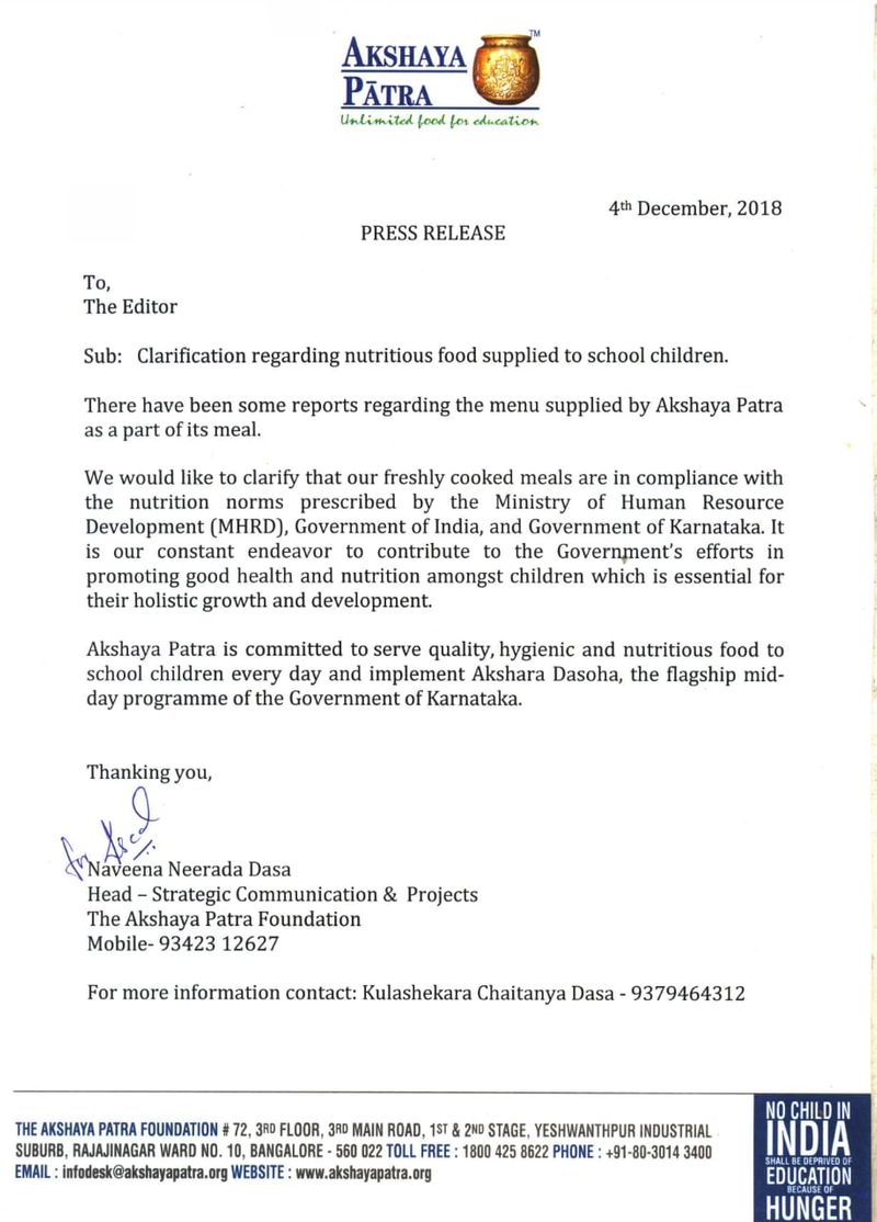 Akshaya Patra made its point very clear in a detailed statement. "We would like to clarify that our freshly-cooked meals are in compliance with the nutrition norms prescribed by the MHRD and government of Karnataka. It is our constant endeavour to contribute to the government's efforts in promoting good health and nutrition among children which is essential for their holistic growth and development,” the foundation said.