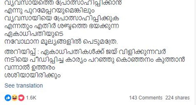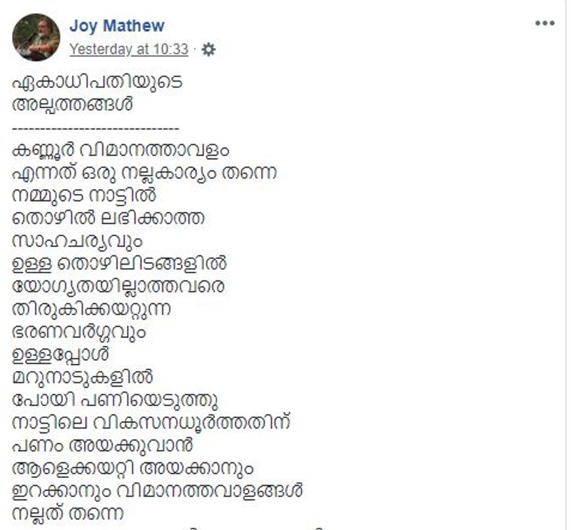 He mocked that we need airports as the government is filling the vacancies in our state with unemployed people. And he wrote on Facebook that Keralites know that Kannur airport became a success because of the works of Achuthanandan and Chandy. He also wrote the ruler who denied this fact is a dictator.