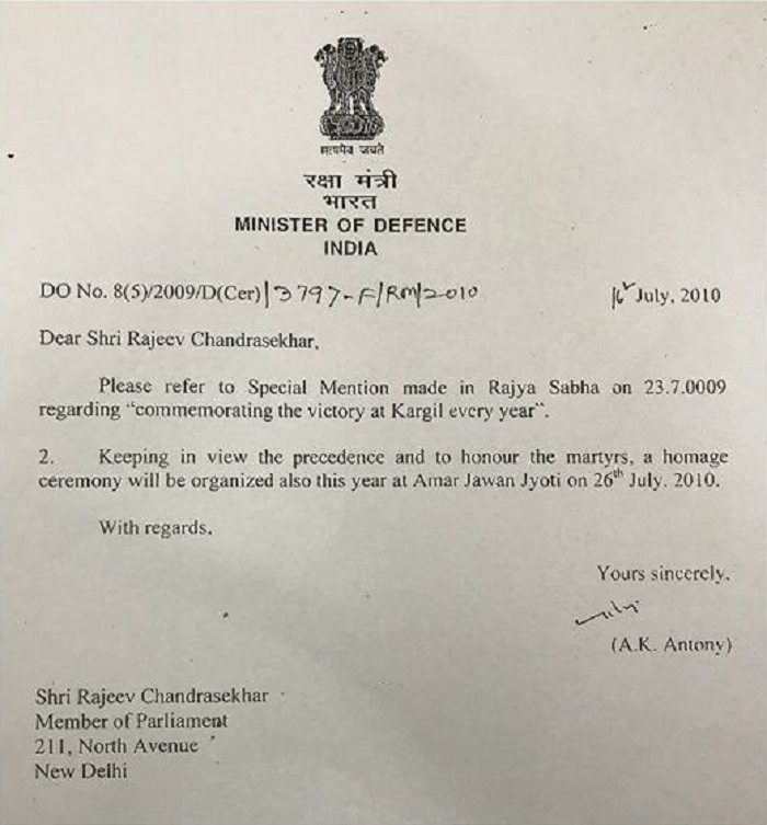 It was BJP MP Rajeev Chandrasekhar, who raised the issue in Parliament in 2009 and ensured that the war heroes were remembered every year on 26 July. On 23 July, 2009, Rajeev Chandrasekhar, under the Matter of Urgent Public Importance, had spoken about Kargil victory in the Rajya Sabha.