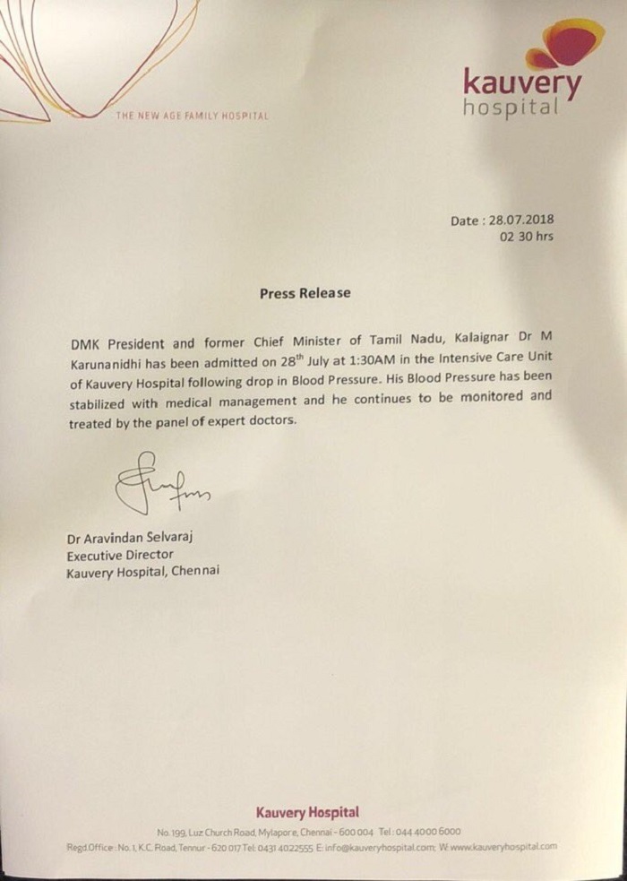 The Kauvery Hospital has released two statements with about the health condition of DMK Chief M Karunanidhi.