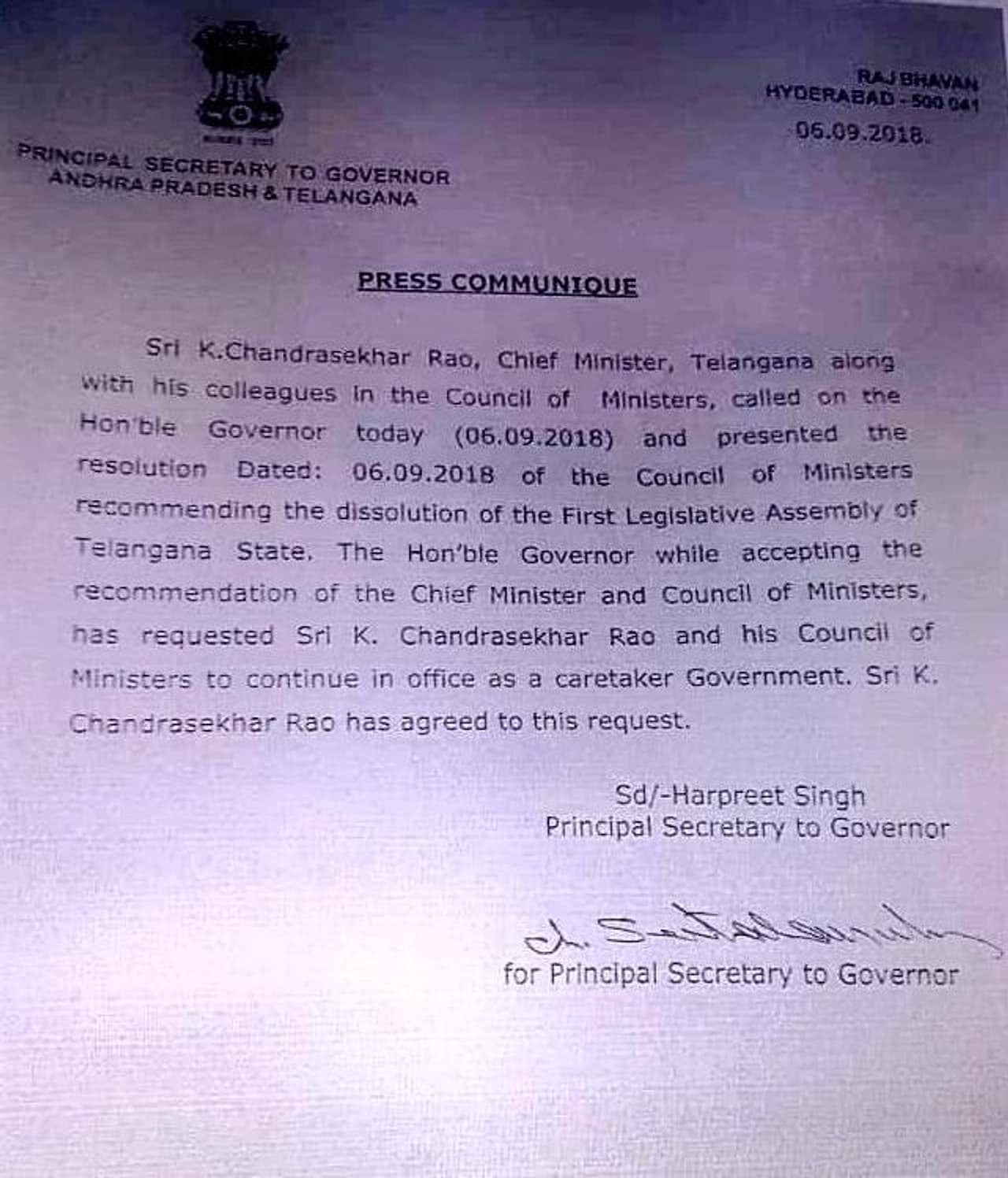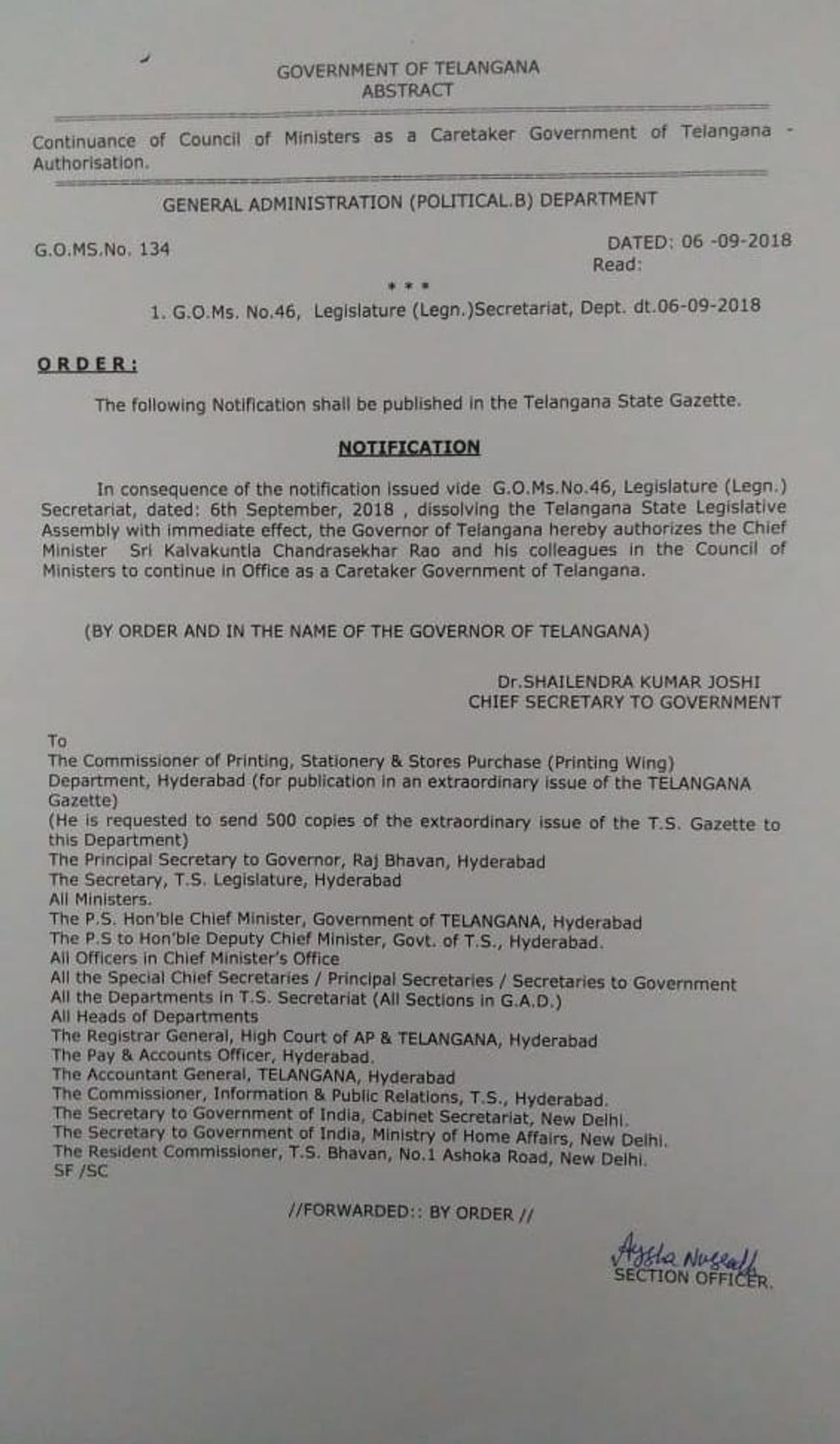 Telangana Governor ESL Narsimhan has accepted the resignation of KCR and appointed him as the care taker chief minister of Telangana. Thus, elections will be held within six months in the State.