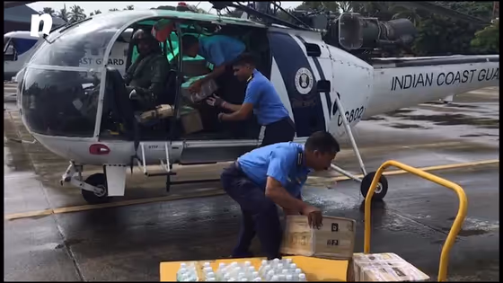 An Indian Coast Guard rescue and relief helicopter carried 1,000 kg of medicines, food packets, drinking water, sanitary napkins, baby diapers, bed sheets, toothpaste etc. and have dropped them at remote and inaccessible flooded areas in Kerala.