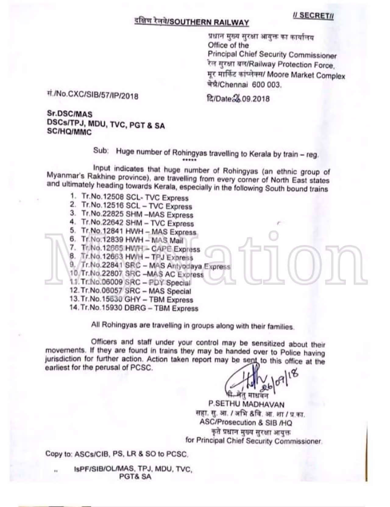 The Railway Protection Force (RPF) has issued a warning to its units in Kerala and Tamil Nadu in this regard, along with a list of 14 trains on which the refugees from Myanmar are likely to be moving to the state with their families.