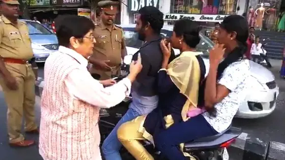 During the campaign, Bedi was telling a man riding a motorcycle with his wife and two children that "such violation of traffic rules will not be tolerated".