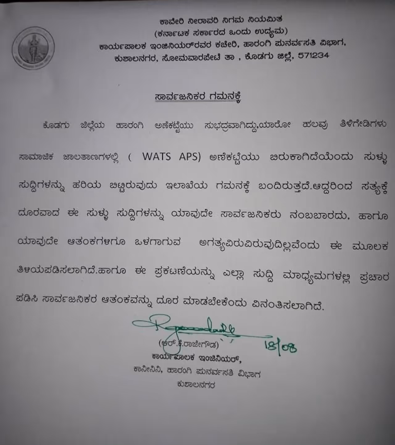 "The Harangi dam in Kodagu district is safe. It has come to the notice of the department that some rumour mongers have spread fake news on WhatsApp that the dam has developed cracks. Thus, the public is hereby asked to no believe these fake news and need not panic."