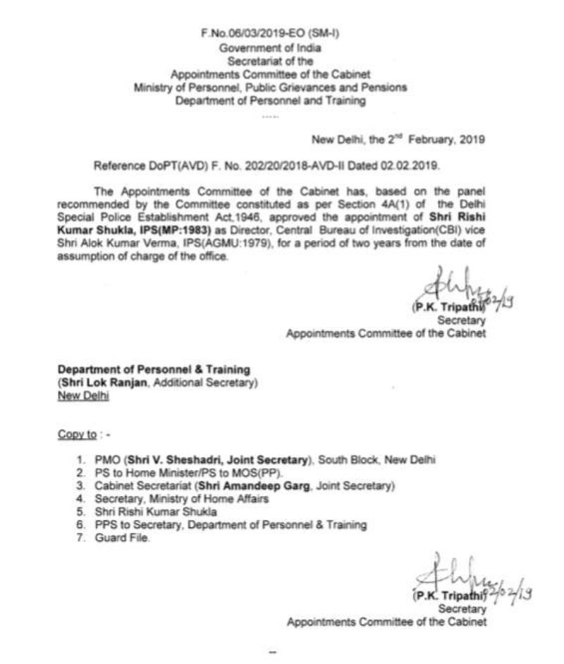 New Delhi: The Narendra Modi-led Appointments Committee on Saturday appointed Madhya Pradesh cadre Indian Police Service (IPS) officer Rishi Kumar Shukla as new director of the Central Bureau of Investigation (CBI). He will take charge on Monday, sources confirmed. He has been selected keeping in mind his non-controversial career. Shukla is known to be close to former Madhya Pradesh chief minister Shivraj Singh Chouhan. Recently, Congress's Kamal Nath had removed Shukla from his post of DGP after taking over from Chouhan.