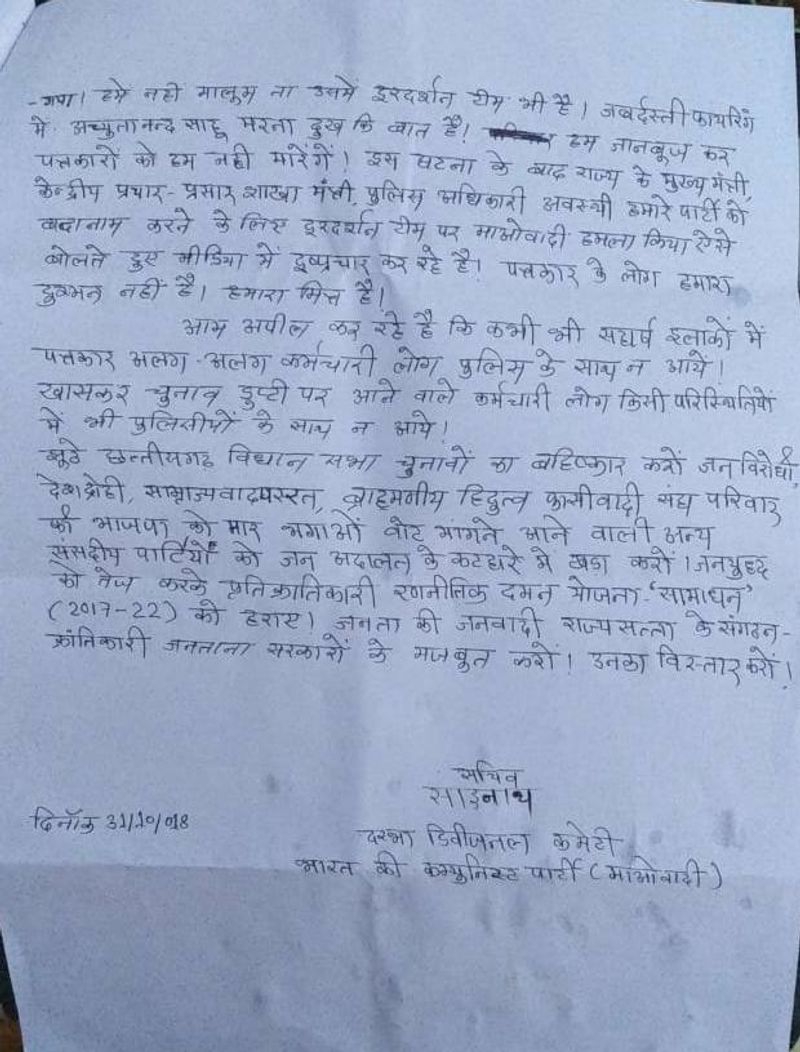 The two-page statement was issued on behalf of Sainath, secretary of Darbha division committee of Maoists. Sainath has allegedly executed several deadly attacks in naxal-hit Bastar, which include the Jhiram attack on May 25, 2013 — the attack that virtually wiped out the Congress in Chhattisgarh.