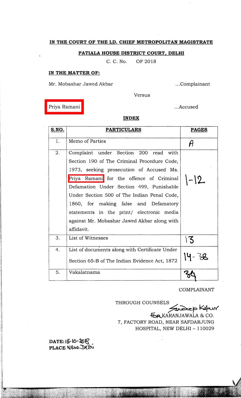 The minister has accused Ramani of "wilfully, deliberately, intentionally and maliciously" defaming him and has sought her prosecution under the penal provision on defamation.