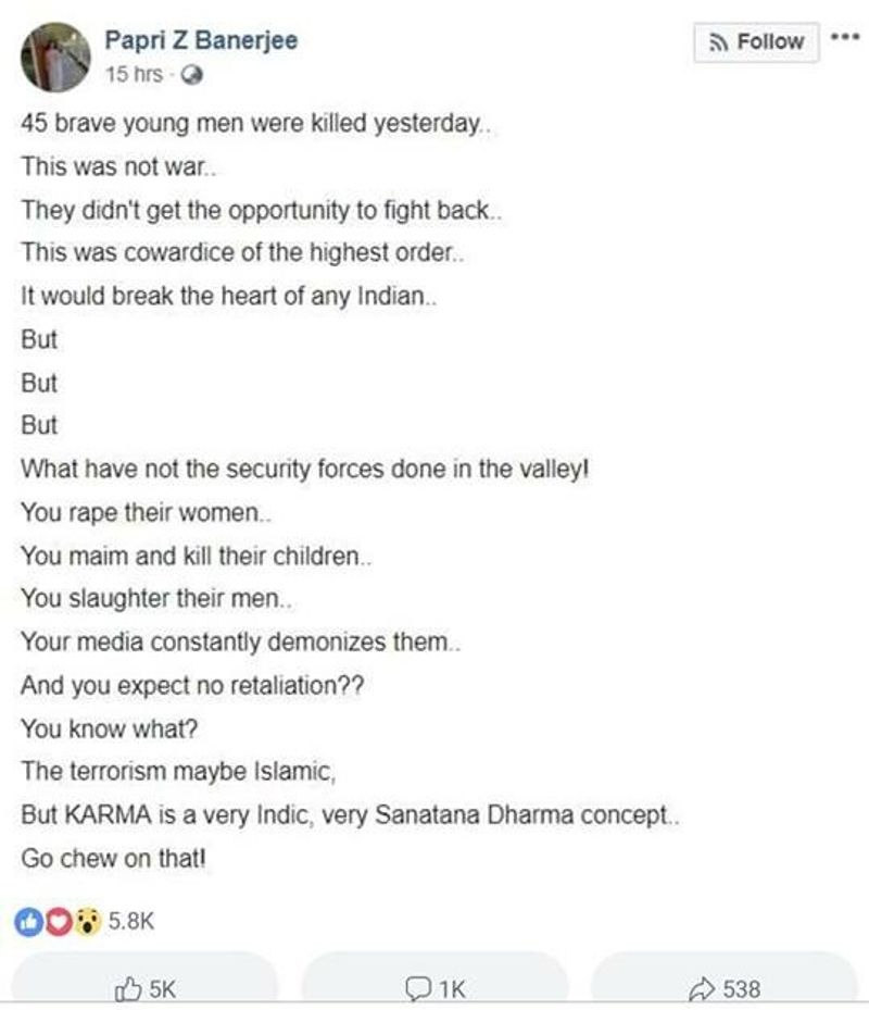 While the Pulwama terror attack was an act of cowardice that broke the hearts of all Indians, Banerjee, on February 15 had posted that – “The terrorism maybe Islamic but Karma is a very Indic concept."