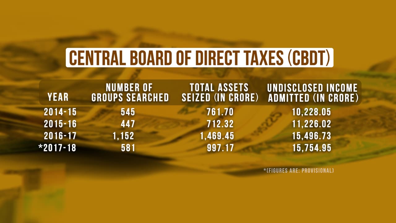 The CBDT has conducted searches on the premises of a total of 2,725 groups. The total undisclosed income the department unearthed is Rs 52,705.75 crore, which their illicit owners have owned up. The CBDT has seized assets worth a total of Rs 3,940.64 crore.