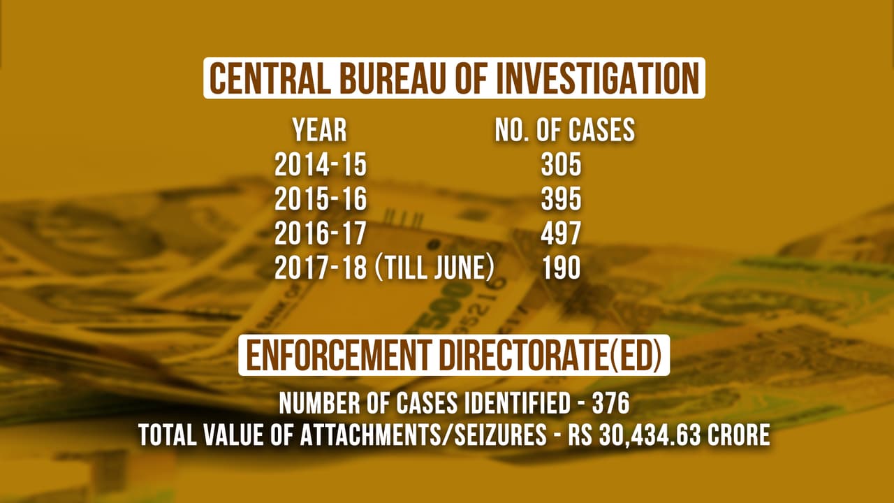 Seven central investigation and intelligence agencies Central Board of Direct Tax, Directorate of Revenue Intelligence, Enforcement Directorate and DG GST intelligence, Central Bureau of Investigation, Serious Fraud Investigation Office and the Registrar of Companies have detected and are investigating a total of 10,674 cases.