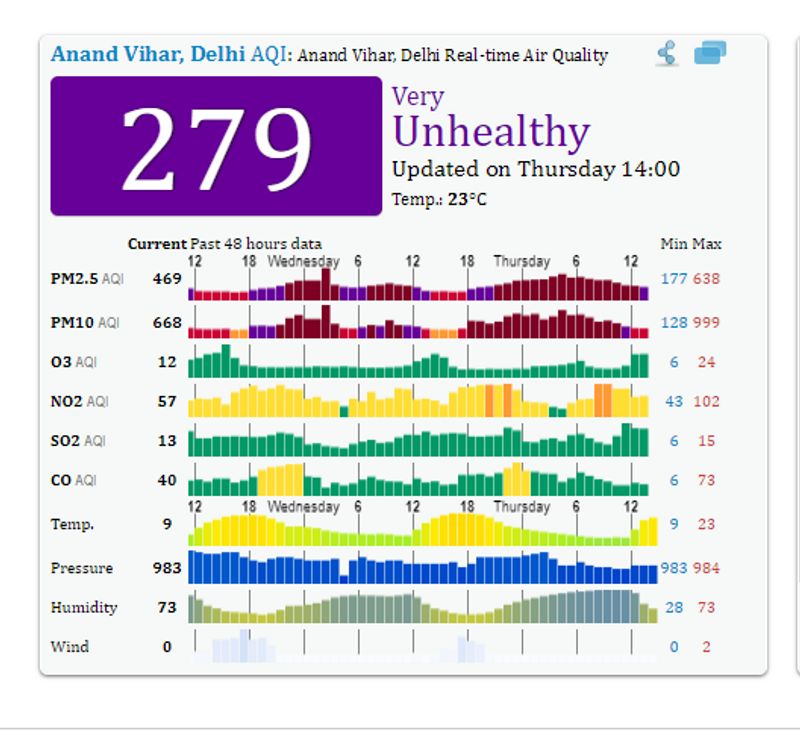 As the latest Air Quality Index (AQI) betrays, Delhi is breathing a “very unhealthy” air at an alarming level of 279 points on the air quality parameters. The PM 10 level (presence in the air of particles with a diameter of less than 10 micrometres) in Delhi stood at 999 and the PM2.5 level was recorded at 638, according to aqicn.org.