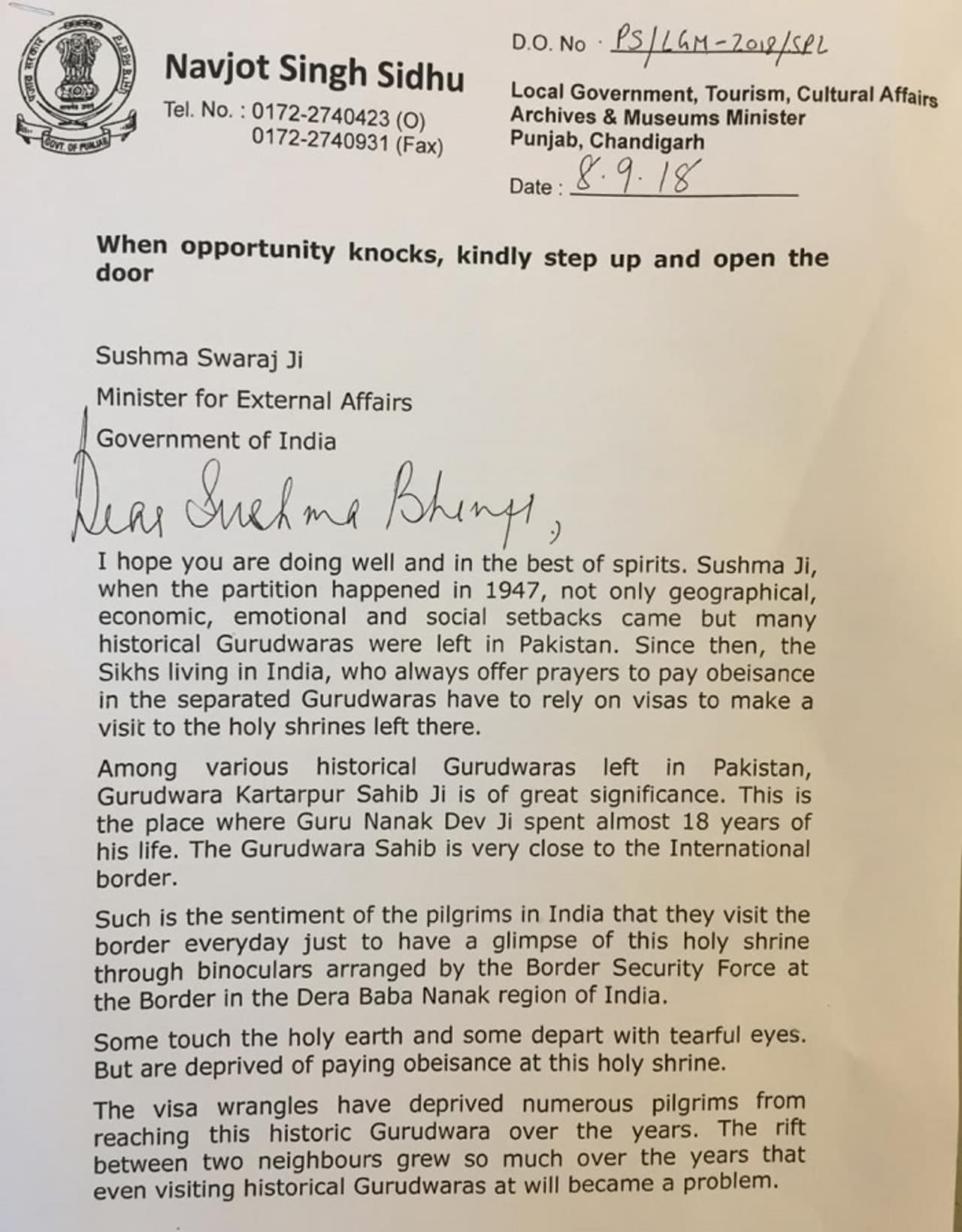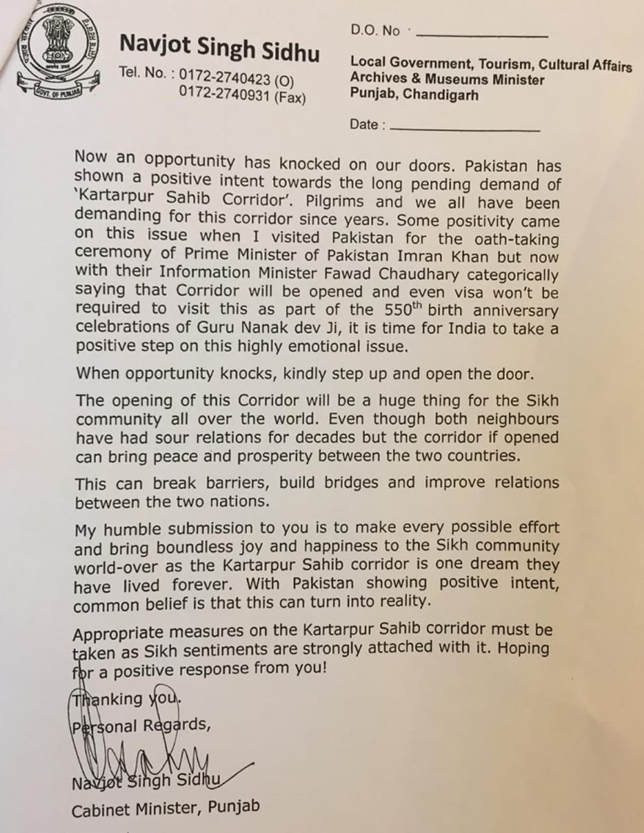Sidhu, a minister in Congress ruled Punjab government, has written a letter to External Affairs Minister Sushma Swaraj asking her to ensure the Kartarpur corridor offer from Pakistan is met with a “positive step” from India.