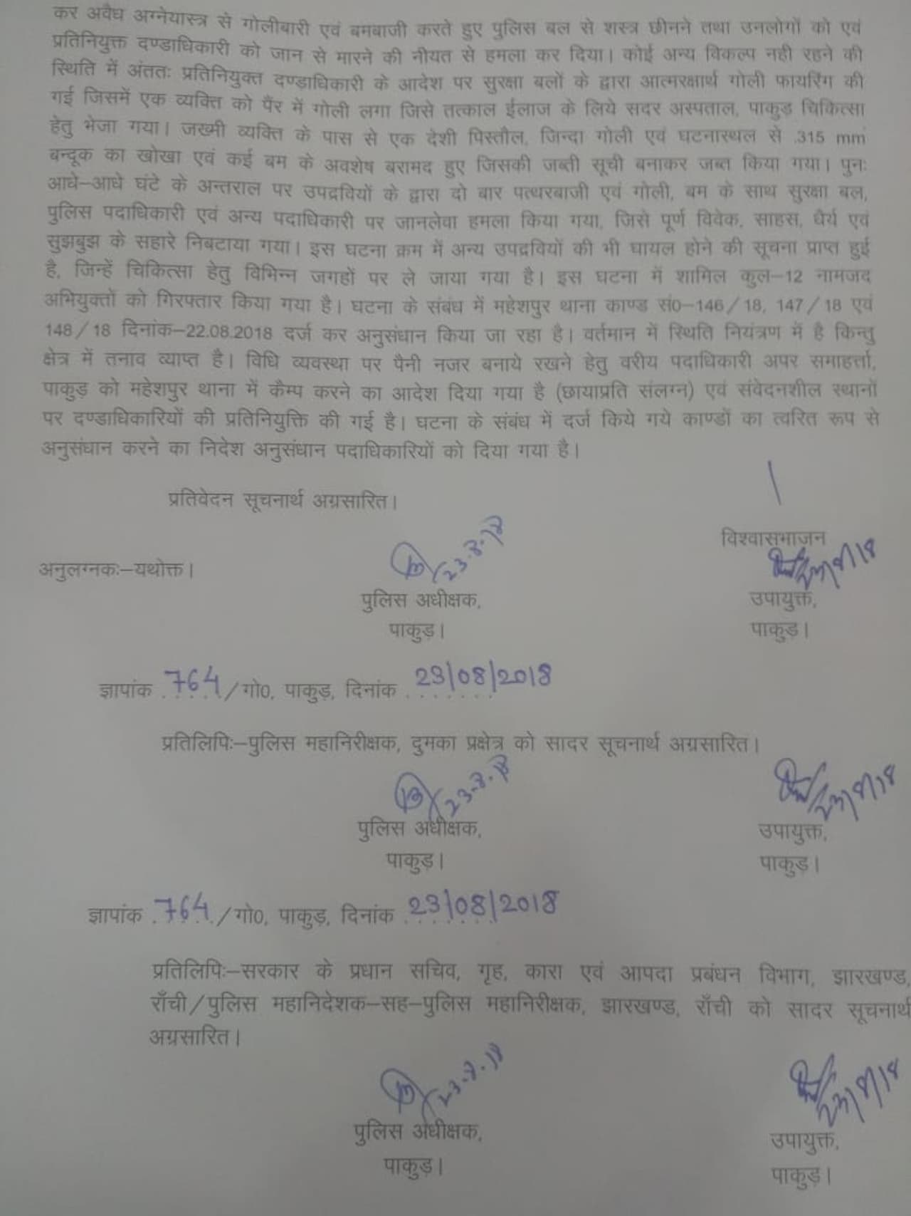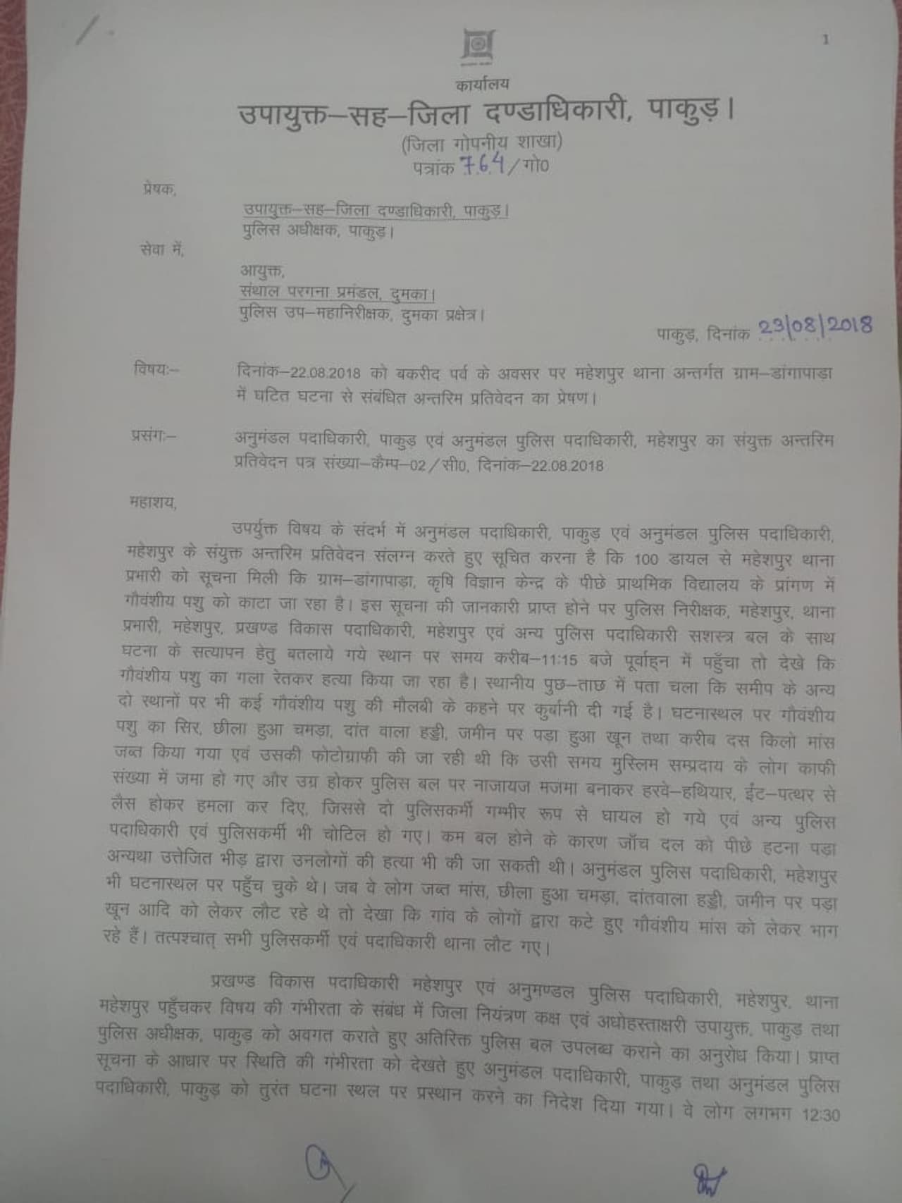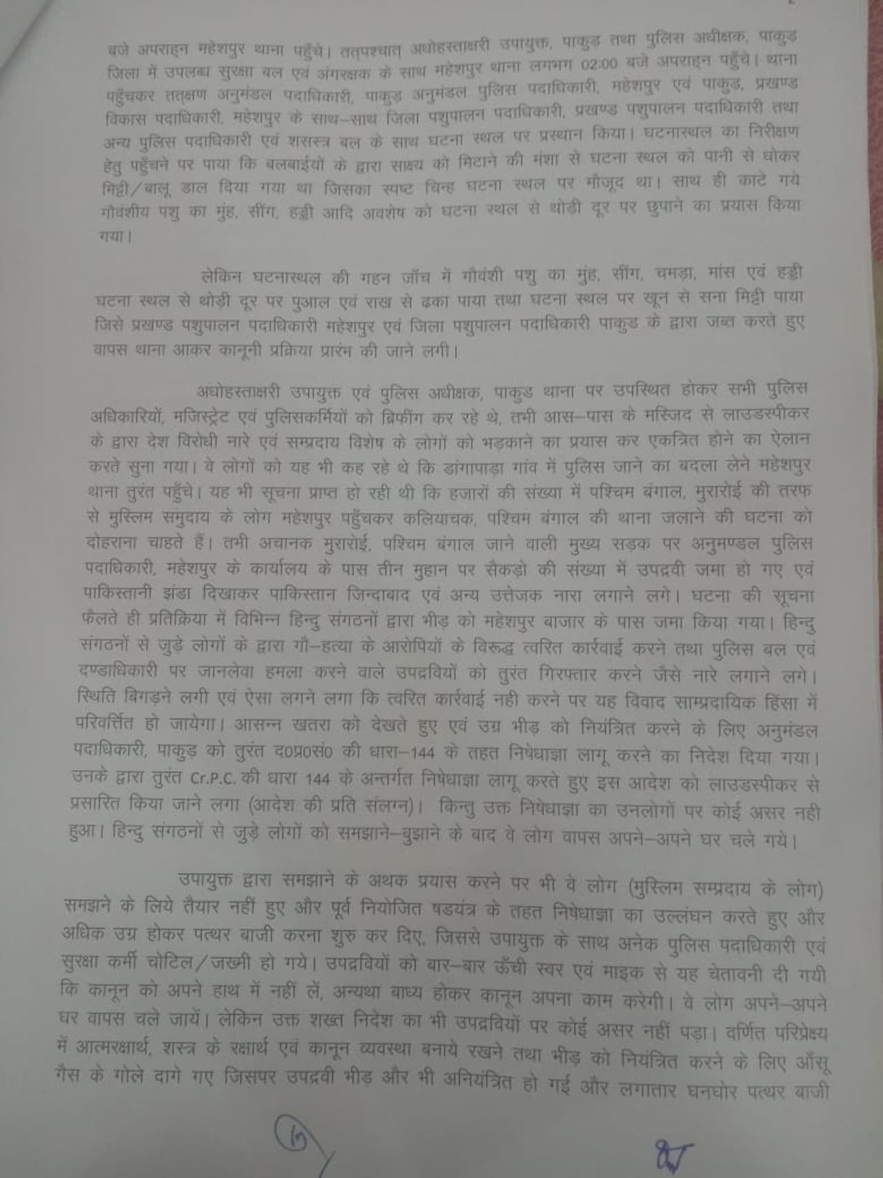 The DC notes: “We were also receiving information that thousands of people from Bengal were marching to Maheshpur. In the meanwhile, hundreds of miscreants coming from the side of Muraroi in Bengal besieged the SDPO office showing Pakistani flags and shouting ‘Pakistan Zindabad’.