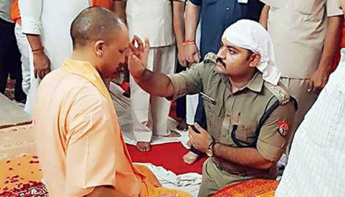 Photographs of a police officer in uniform kneeling down at the feet of Uttar Pradesh Chief Minister Yogi Adityanath, on the occasion of Guru Purnima at the Gorakhnath temple here, went viral on social media.