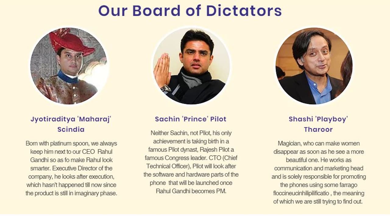 Board of dictators — not directors — that’s how the spoof site describes Jyotiraditya Scindia, Sachin Pilot and Shashi Tharoor, the three close aides of Rahul Gandhi. The brief biographies of the three try to focus on nepotism in the Congress, albeit in a funny manner.