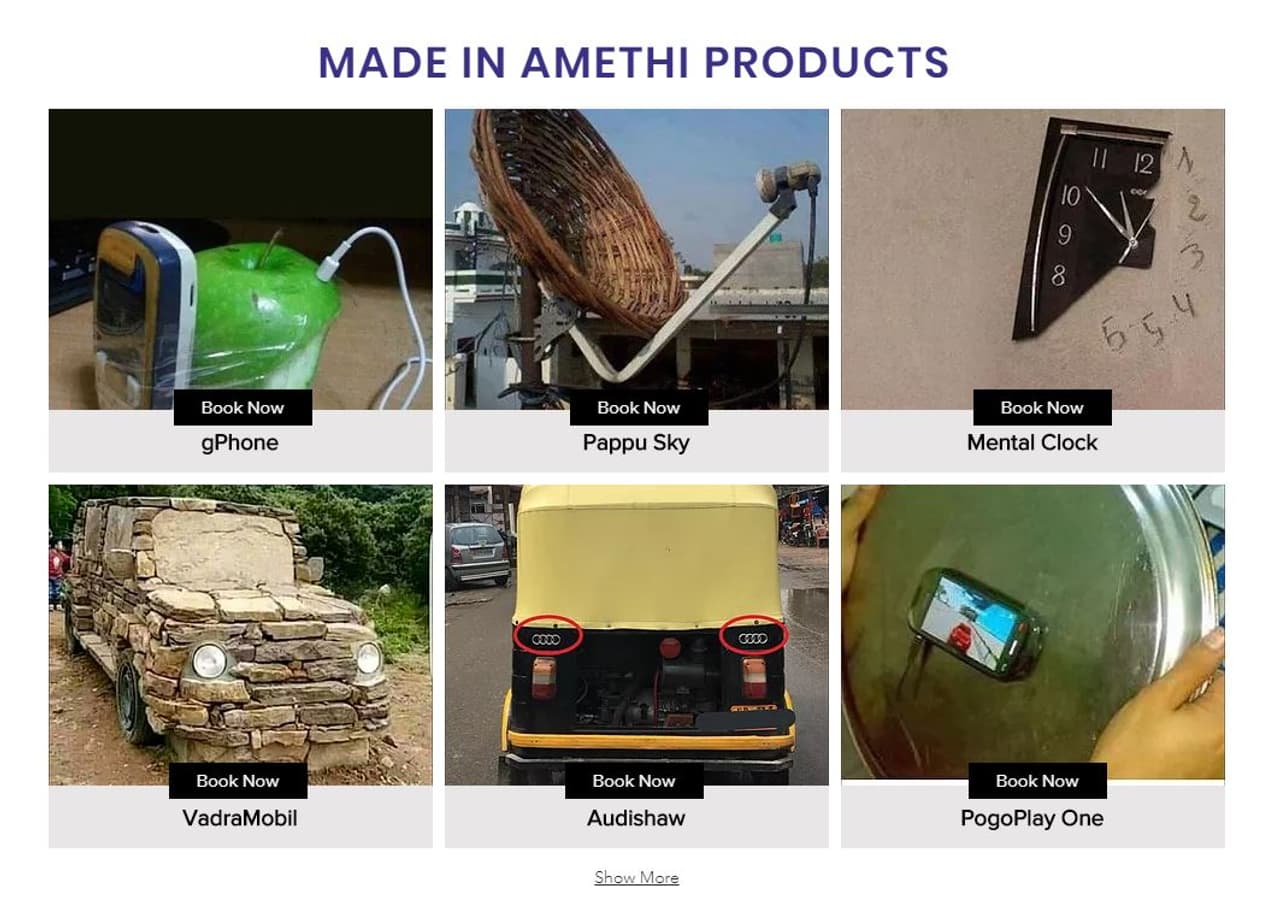 The website does not stop at that. It makes a detailed list of products under the imaginary banner of “Made in Amethi”. An old Nokia charger that is now almost out of use, a mobile made by Bharat Heavy Electrical Limited (BHEL), an imaginary machine that turns potato into gold, a broken wall clock — the list of digs are endless.