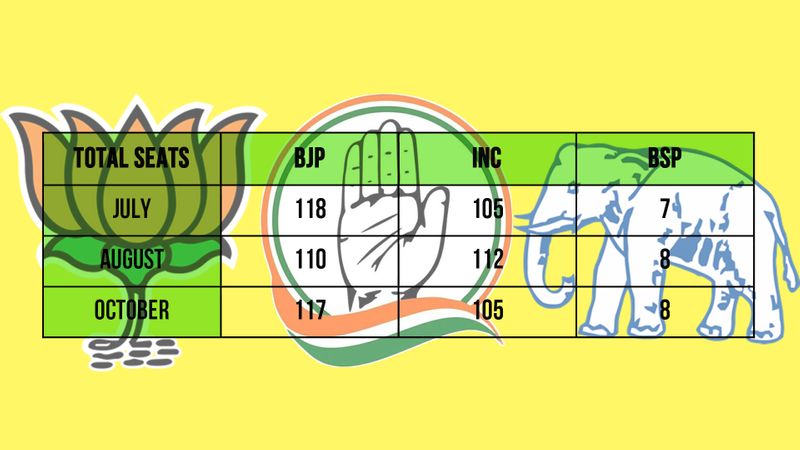 During opinion polls over three months, the Neta App found the BJP leading with 118 seats, and put the Congress's tally at 105 and that of BSP at 7 in July. In August, the Congress’s seats increased to 112, only to fall to 105 again in October