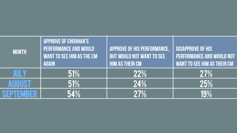 The approval ratings of incumbent chief minister Shivraj Singh Chouhan remain quite high as 54% of the respondents ticked him as their first choice for the post. His report card among the respondents is as follows:
