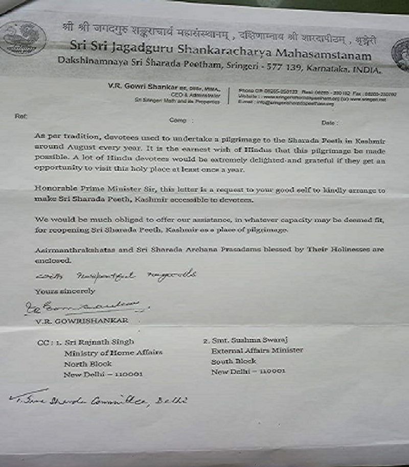The Sringeri Sharada Peetha mutt administrative officer VR Gowri Shankar had written a letter to the Prime Minister appealing to him on reviving the Sarvajna Peetha in PoK.