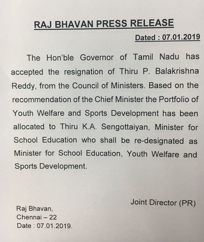His resignation from the post of Youth Welfare and Sports Development minister was accepted by Governor Banwarilal Purohit. As suggested by chief minister K Palaniswami, KA Sengotttaiyan has been given Balakrishna's portfolio. Sengotttaiyan is also the minister of School Education.