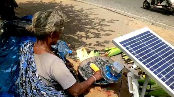 The 80-year-old Selvamma has been selling corn in Bengaluru for 18 years and an NGO gifted her a DC fan made by Selco company making her work easy.