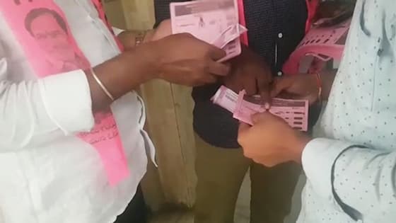 A video of Telangana Rashtra Samithi (TRS) leaders distributing money to voters along with ballot papers in Warangal city has gone viral. The leaders are seen distributing Rs 2,000 notes along with model ballot paper. Telangana is going for Assembly election on December 7. Campaigning has come to an end.