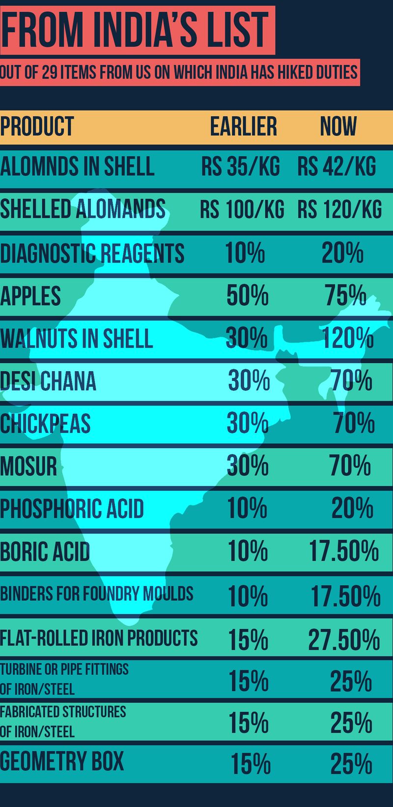 In May, India proposed to raise duties by up to 100% on 20 products, such as almonds, apple and specific motorcycles imported from the US before WTO. Though the amount is marginal, the step was noticed, because it occurs alongside retaliatory tariffs on US imports by China, the European Union and, Canada and Mexico, the US’ North American Free Trade Agreement partners.
