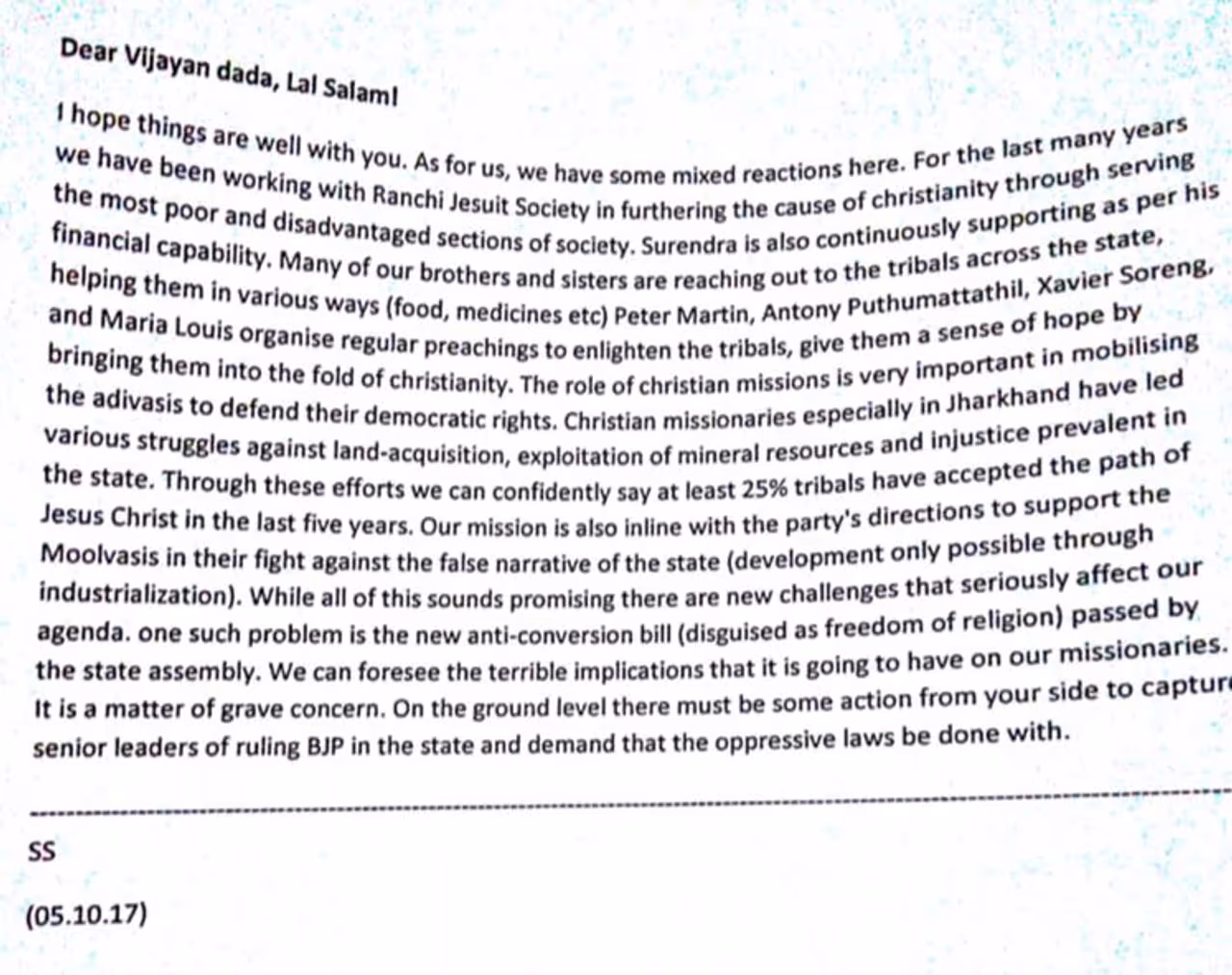 “For the last many years, we have been working with Ranchi Jesuit Society,” wrote one Vijayan Dada to one SS in an intercepted letter, “in furthering the cause of Christianity through serving the most poor and disadvantaged sections of society.” “Surendra is also continuously supporting (sic) as per his financial capability,” the letter reads. Surendra, the police say, is Surendra Gadling.