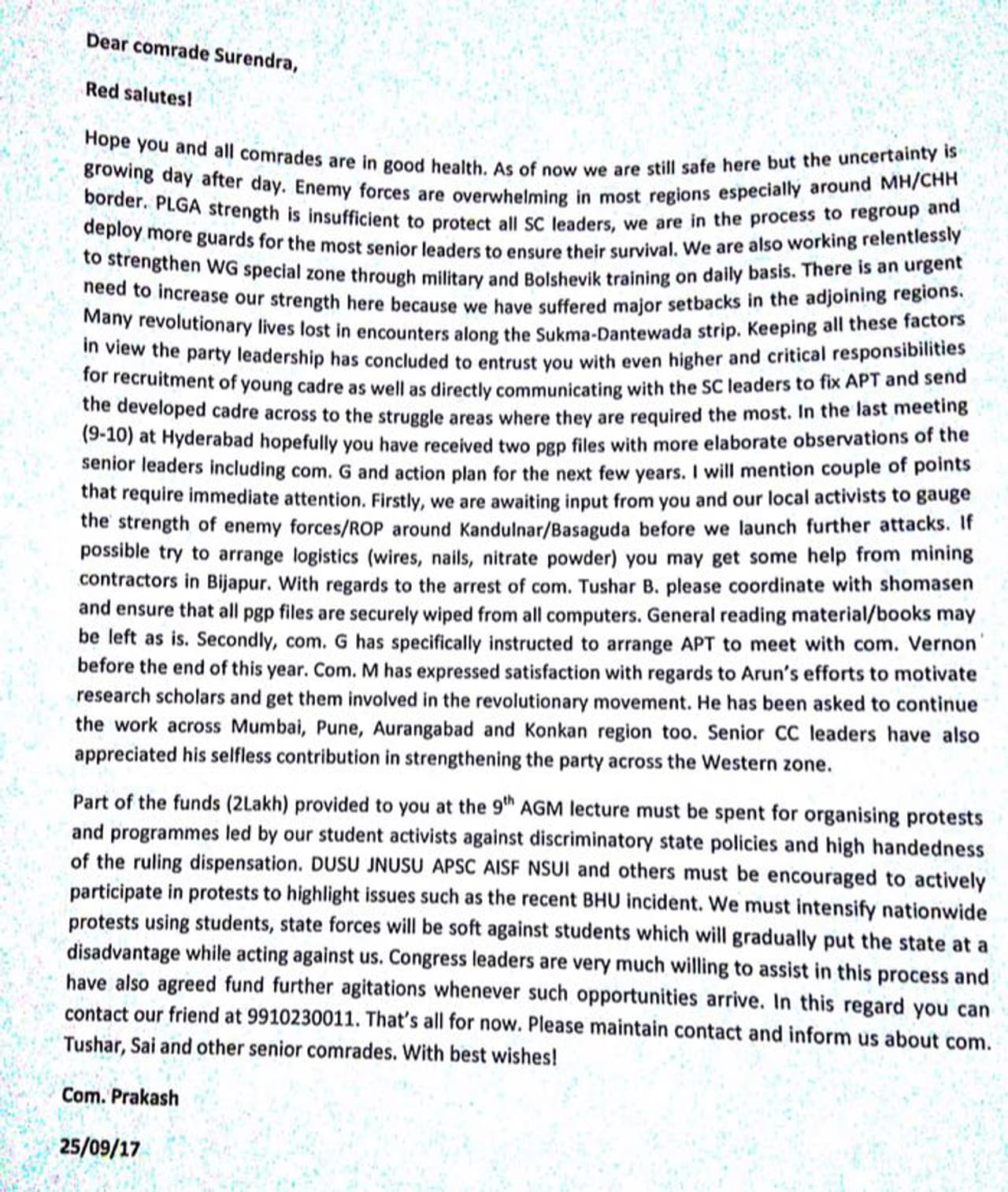 In the letter accessed by MyNation, comrade Surendra, who in the naxal correspondences is revealed to be a close associate of arrested urban naxal Varavara Rao, apparently talks about passing on funds received from Rao for several disruptive and violent activities. One such purpose of the money looks to be paying professors at different colleges and universities, from Delhi to Hyderabad.