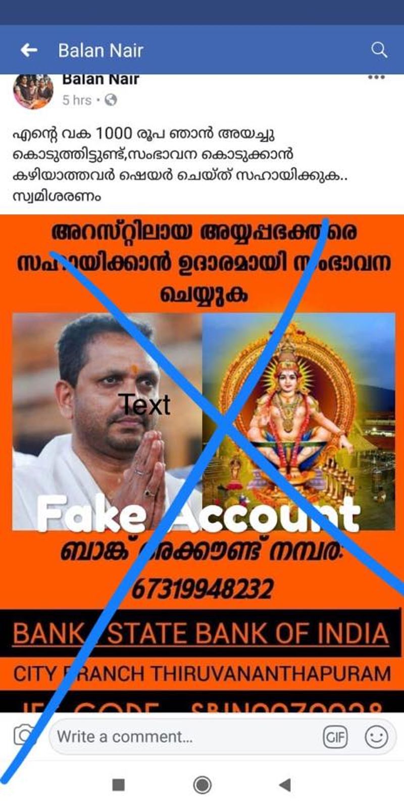 "Karma Samithi is collecting money for Ayyappa devotees, who have been arrested for fake cases and the liars of the Vijayan government created a new advertisement, which includes the CMDRF bank account number with a clear aim to cheat many Ayyappa devotees and make money," said Rupesh, an activist from Kerala.