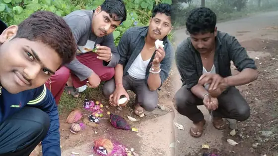 Youth from the NGO Human Compliance Forum in Belagavi, Karnataka, on Thursday demonstrated in public view that the so-called black magic was bogus. Members of the NGO ate fruits allegedly used for black magic, which lay on the road. Satish Jarkiholi, the president of the NGO wanted to put out a message that back magic is fake and nobody should believe in such things.