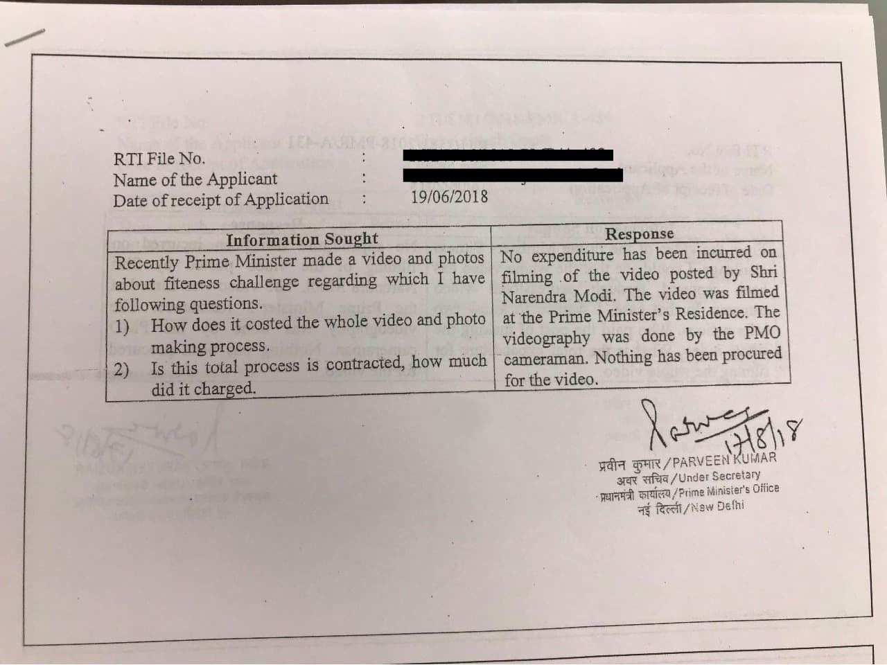 “No expenditure has been incurred on (the) filming of the video posted by Shri Narendra Modi. The video was filmed at the Prime Minister’s Residence. The videography was done by the PMO cameraman. Nothing has been procured for the video,” the PMO said in reply to an RTI application. The RTI had sought to know the cost of making the video and of giving the contract.