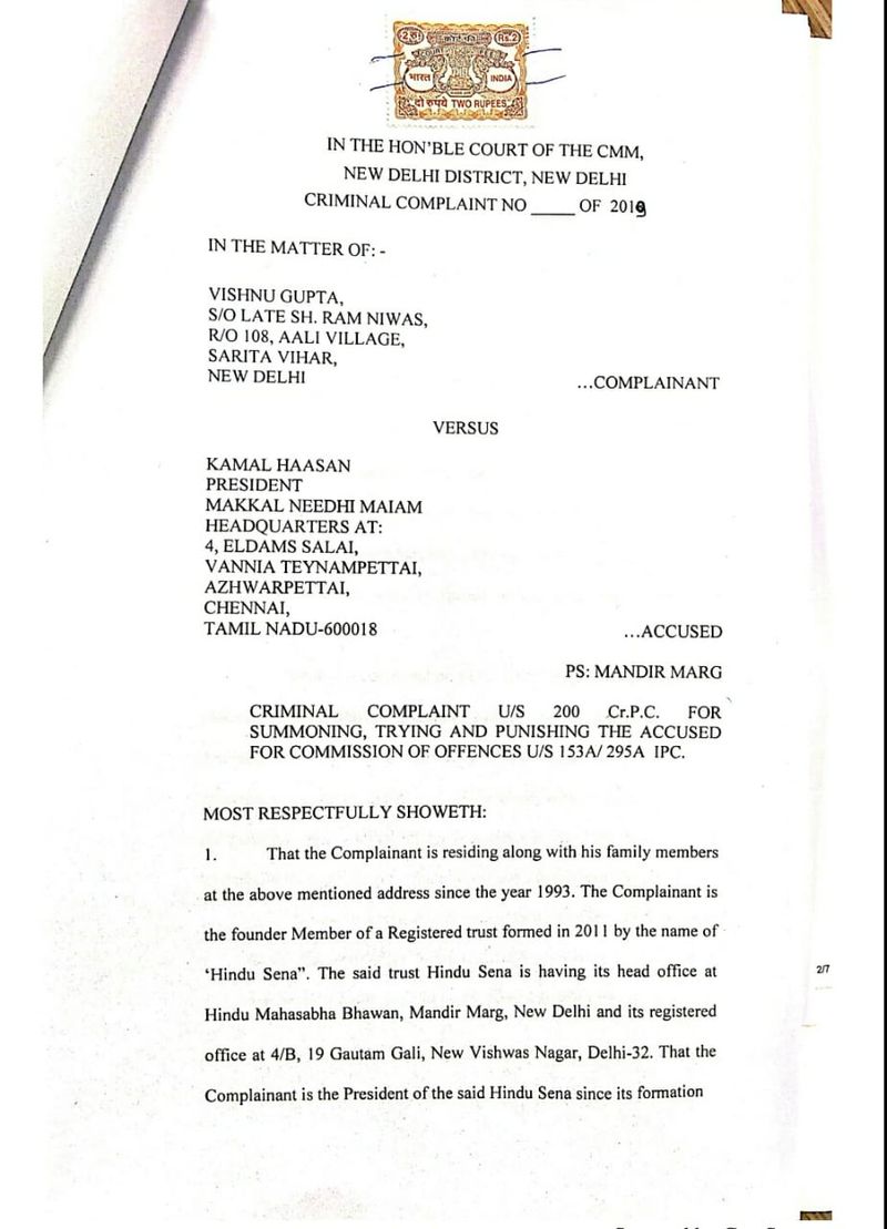 Hindu Sena chief Vishnu Gupta moved the court against Kamal Haasan for having hurt the sentiments of Hindus without any basis, and for trying to create enmity among the followers of different religions